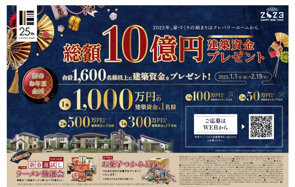 さて、2023年家づくりの始まりに、クレバリーホームから新春お年玉企画といたしまして、建築資金総額10億円プレゼントキャンペーンを開催いたします。